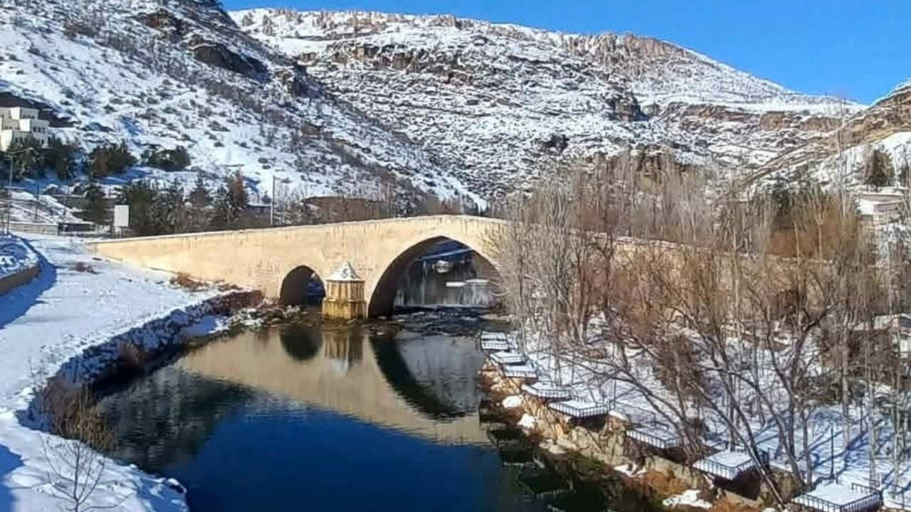 Yaklaşık 847 yıllık tarihi yapının karla kaplanmasıyla ortaya çıkan manzara, görenleri kendine hayran bıraktı. Taş işçiliği ve mimari zarafetiyle dikkat çeken köprü, kış mevsiminde adeta kartpostallık görüntüler sundu.