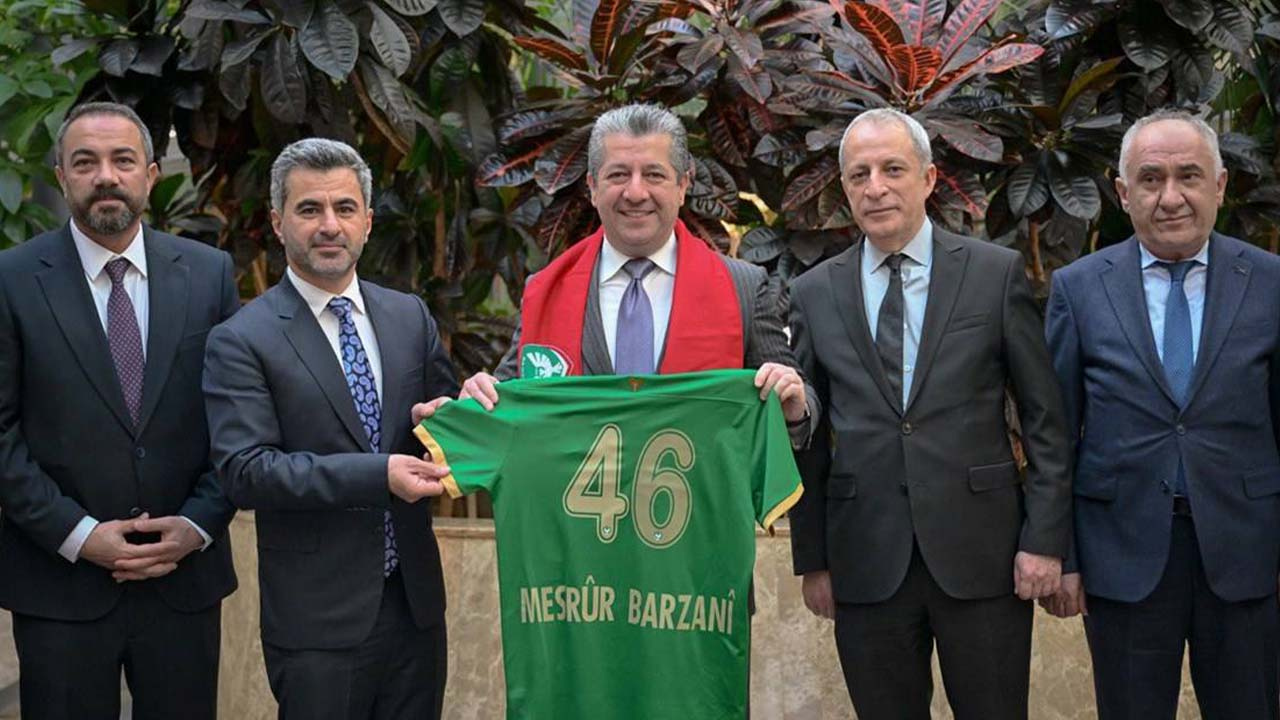 Amedspor Başkanı Nahit Eren ve beraberindeki heyet, Kürdistan Bölgesi’nin başkenti Erbil’de Başbakan Mesrur Barzani ile bir araya geldi. Görüşmede Barzani’ye Amedspor forması hediye edildi.