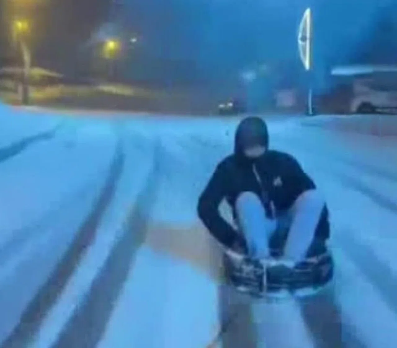 Bölge sakinlerinden bir genç, kar üzerinde kaymanın pratik bir yolunu buldu. Bir otomobilin arkasına bağladığı araç lastiğine oturarak, arkadaşının kullandığı aracı takip etti. Karlı yolda sürüklenen lastik, doğaçlama bir kayak pisti görevi gördü.