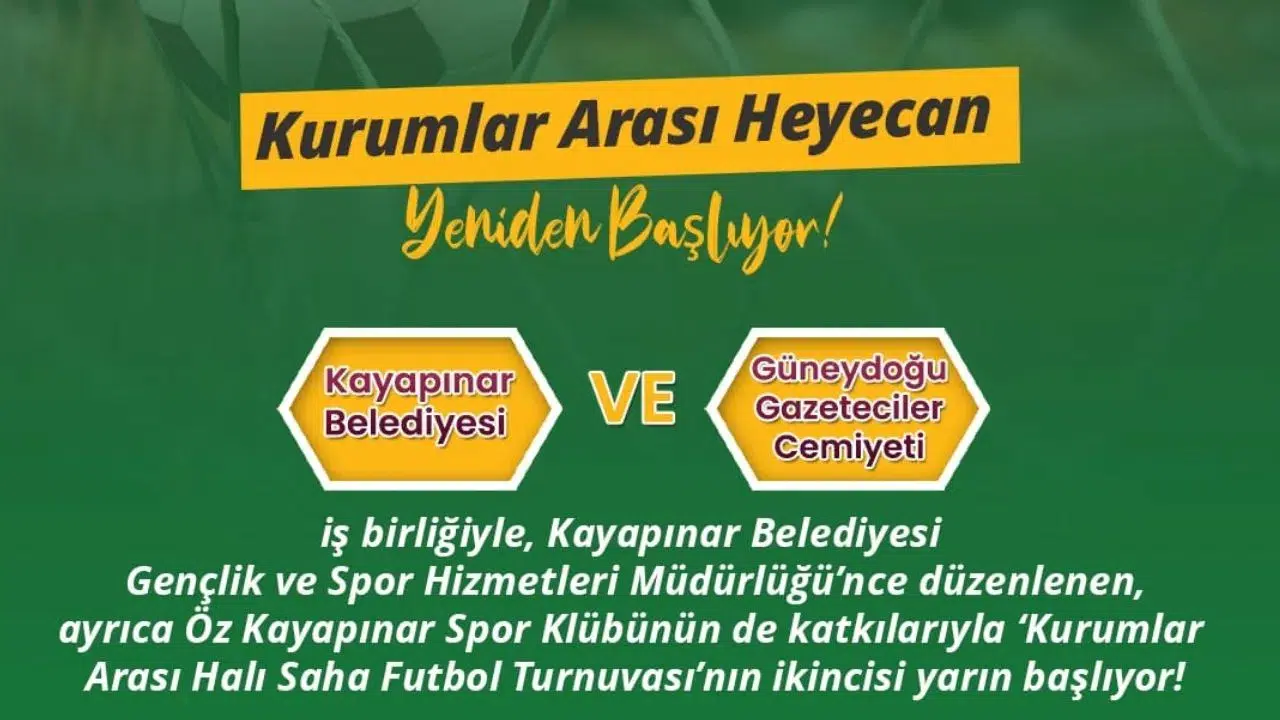 Diyarbakır'da Kayapınar Belediyesi ile Güneydoğu Gazeteciler Cemiyeti iş birliğinde düzenlenen ‘Kurumlar Arası Halı Saha Futbol Turnuvası’nın ikincisi yarın start alıyor. Heyecan dolu karşılaşmalar, 28 Nisan 2026 Salı günü saat 18.00’da Kayapınar Belediyesi 500 Evler Spor Kompleksi’nde oynanacak.
