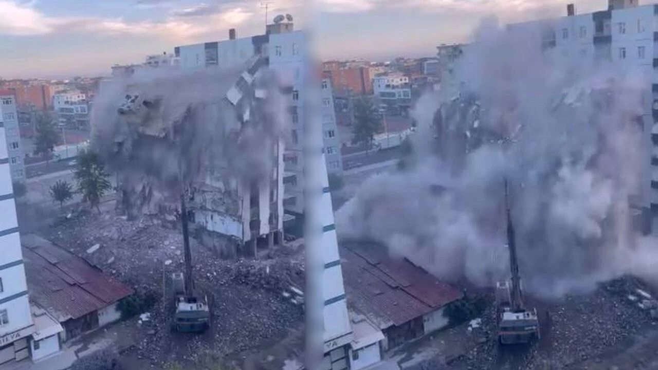 2023 yılında Kahramanmaraş merkezli depremlerden etkilenen Diyarbakır’da, hasarlı yapıların yıkım süreci devam ediyor. Merkez Bağlar ilçesi Cezaevi Üst Köşe semtinde bulunan 8 katlı ağır hasarlı bir bina, iş makinesinin dokunuşuyla tamamen çöktü.