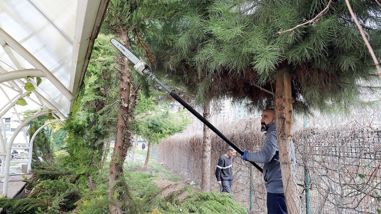 Park ve Bahçeler Müdürlüğü ekipleri, cadde ve sokaklarda kuruyan ya da kırılma riski taşıyan dalları tespit ediyor. Kar ve soğuk hava yüzünden zayıflayan ağaçlar için hummalı bir mesai harcanıyor.