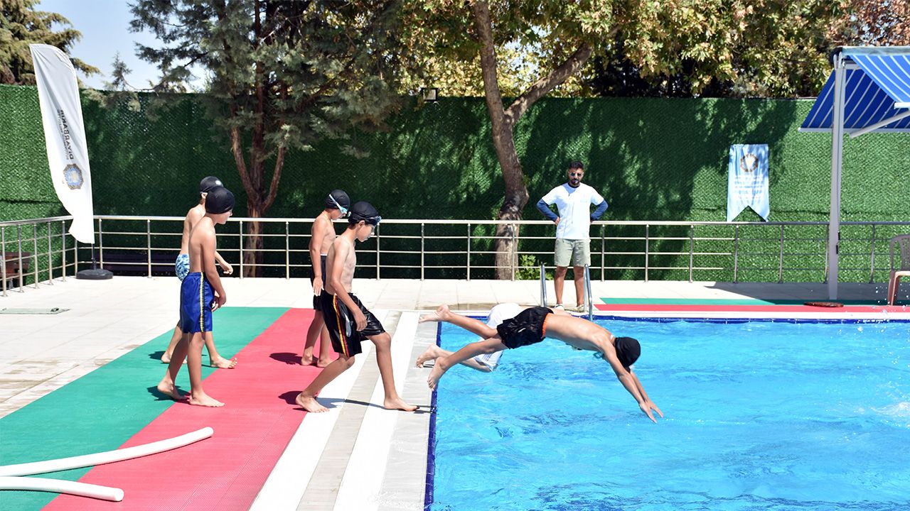 Belediyeye ait servis araçlarıyla Seyrantepe Yarı Olimpik Yüzme Havuzu’na götürülen çocuklara bone ve yüzme gözlüğü dağıtıldı. Uzman eğitmenler eşliğinde verilen eğitimlerde çocuklar temel yüzme tekniklerini öğrenirken, suyun keyfini çıkardı.