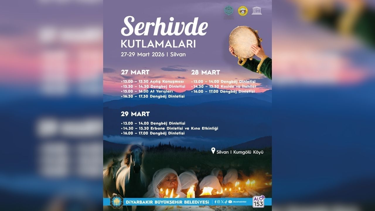 27-28-29 Mart 2026 tarihlerinde Silvan Kumgölü Mahallesi'nde gerçekleştirilecek şenlik programında dengbêj dinletileri, erbane performansları, kaside ve ilahilerle yurttaşlar bir araya gelecek. Geleneksel etkinliklerle baharın gelişi coşkuyla kutlanacak.