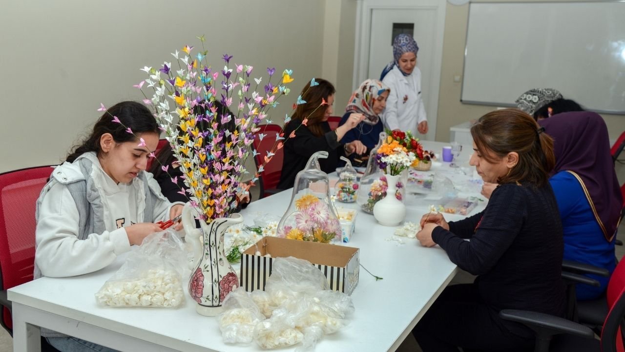 Bağlama, ses eğitimi, cilt bakımı, amigurumi, e-ticaret, kuaförlük, moda tasarım, dikiş, ahşap oyuncak, bazalt taş işlemeciliği, çini ve karakalem gibi birçok branşta eğitim veriliyor. Her kursun kontenjanı 15 kişi ve tamamen dolu.