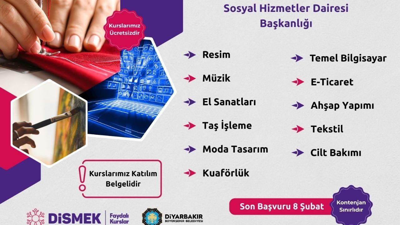 Kursiyer adayları için zaman daralıyor. Sınırlı kontenjanlara sahip kurslara kayıt yaptırmak isteyenlerin 8 Şubat Cumartesi günü mesai bitimine kadar başvurularını tamamlaması gerekiyor. Eğitimler, Sümerpark ve Göletlipark'taki kurs merkezlerinde gerçekleşecek. Detaylı bilgi ve online başvuru için vatandaşlar, dismek.diyarbakir.bel.tr adresini ziyaret edebilir.