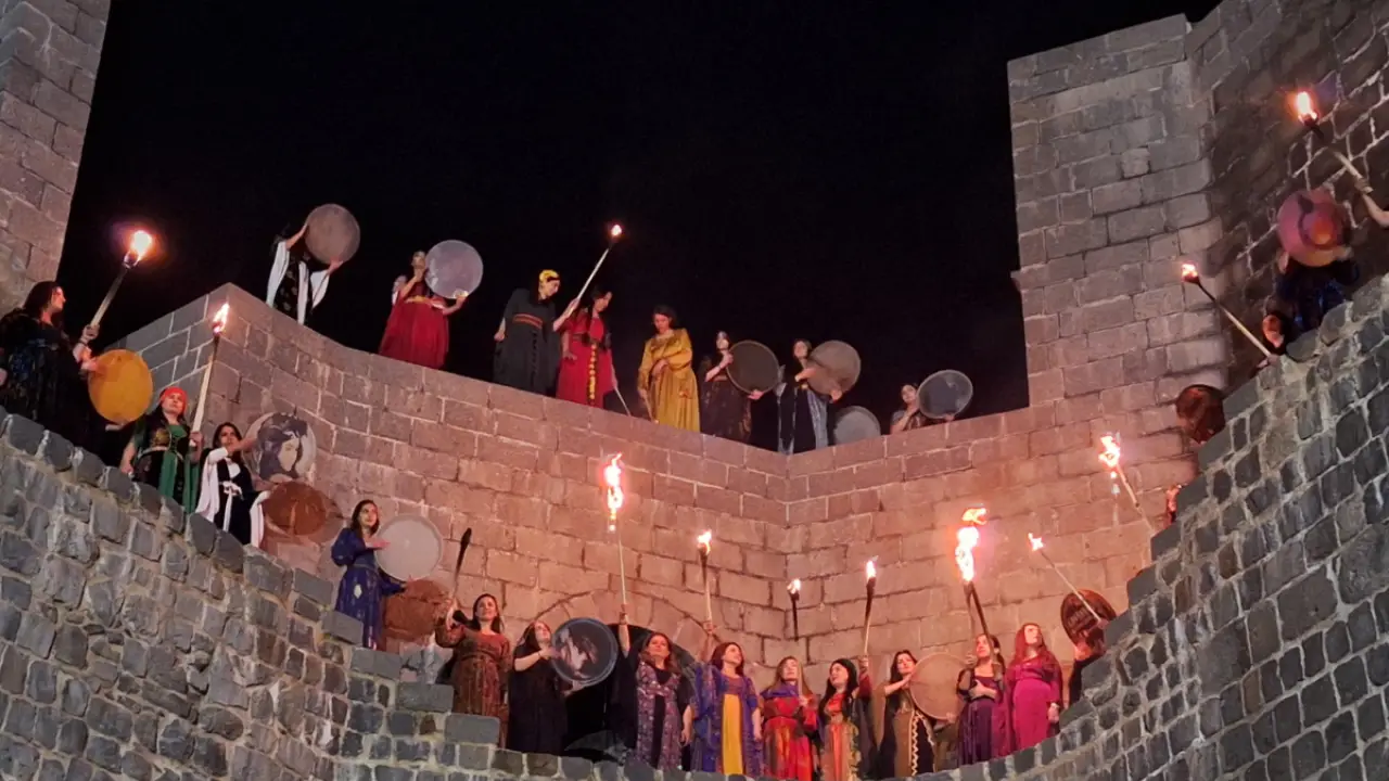 Dicle Fırat Kültür Merkezi sanatçıları erbaneleriyle burçlara doğru yürüyüş gerçekleştirdi. Yakılan meşaleleri devralan kadınlar, erbaneler eşliğinde tarihi surların zirvesine çıkarak etkinliğe katılanlara görsel bir şölen sundu.