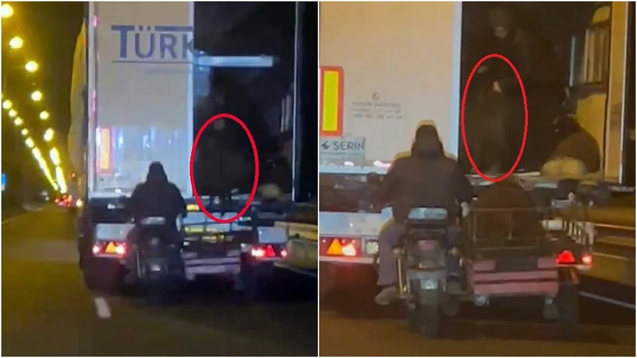Görgü tanıklarının cep telefonuyla kaydettiği görüntülerde, canlı hayvan yüklü kamyona sepetli motosikletle yaklaşan iki kişinin, aracın arka kapısını açarak koyunları motosikletin sepetine attığı görüldü.