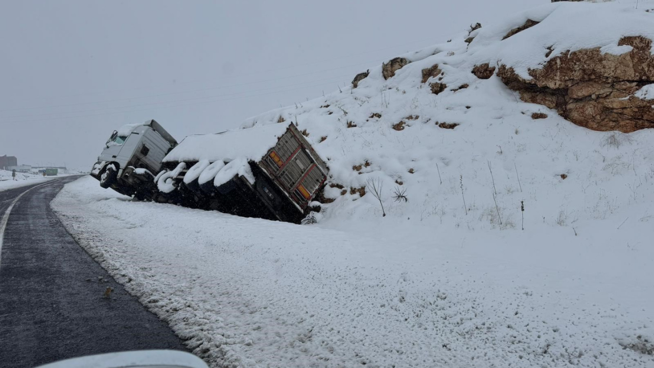 Diyarbakır’da etkili olan yoğun kar yağışı, trafik kazalarını da beraberinde getirdi. Ergani-Elazığ karayolunda meydana gelen kazada, sürücüsünün direksiyon hâkimiyetini kaybettiği tır yol kenarına devrildi.