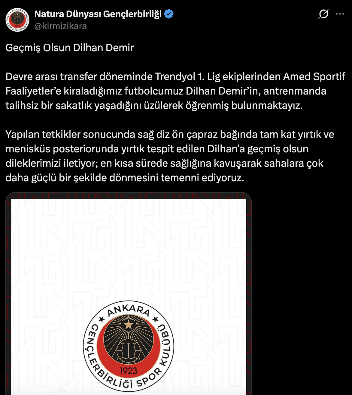 Trendyol 1. Lig ekiplerinden Amed Sportif Faaliyetler’de antrenmanda sakatlanan Dilhan Demir için kulübü Natura Dünyası Gençlerbirliği “geçmiş olsun” mesajı yayımladı. Başkent temsilcisi, devre arası transfer döneminde kiraladığı futbolcunun yaşadığı talihsiz sakatlık nedeniyle üzüntü duyduğunu bildirdi.