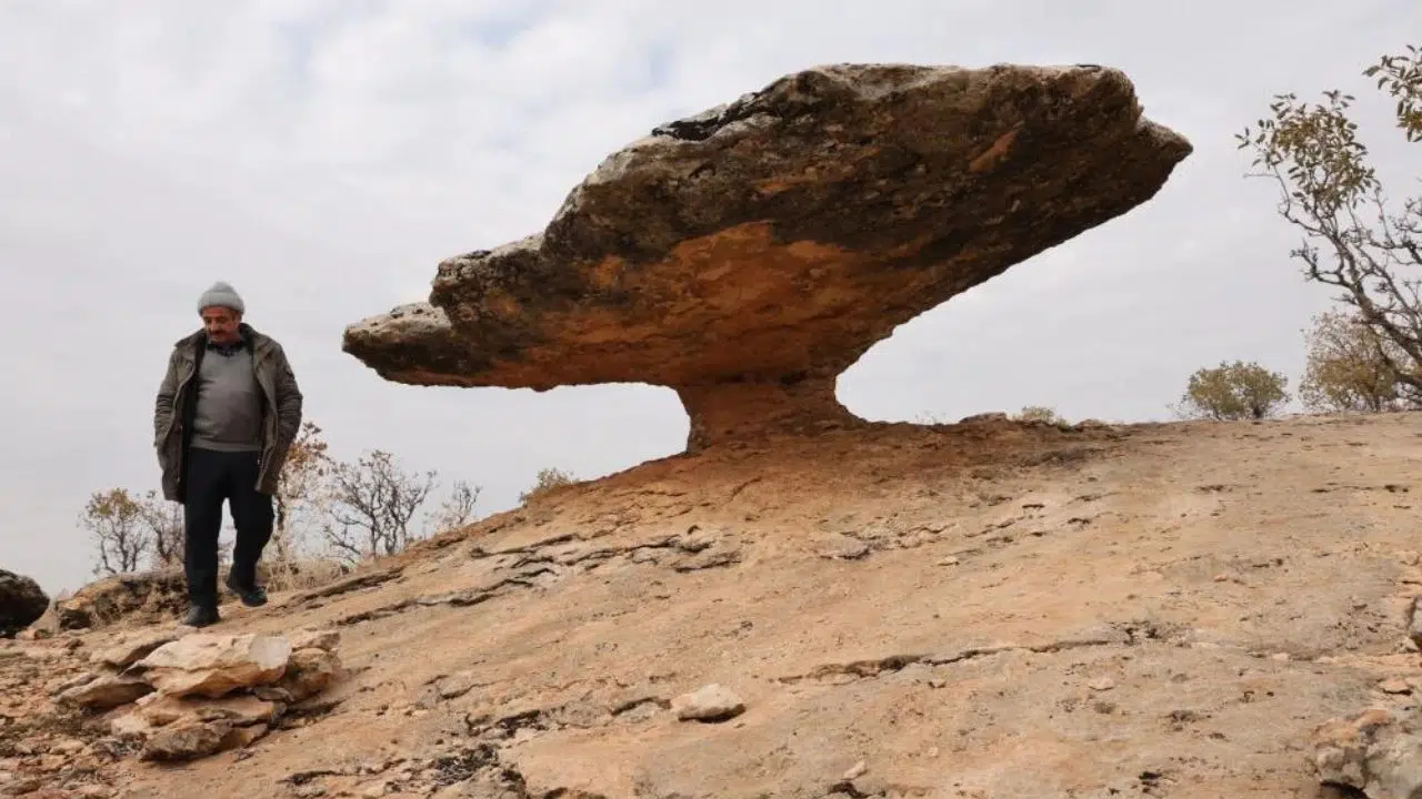 Diyarbakır’ın Kocaköy ilçesindeki mantar kaya, buzul çağından günümüze uzanan jeolojik yapısıyla dikkat çekiyor. Uzmanlara göre milyonlarca yıllık doğal oluşum, bölgenin tarihine ışık tutuyor.
