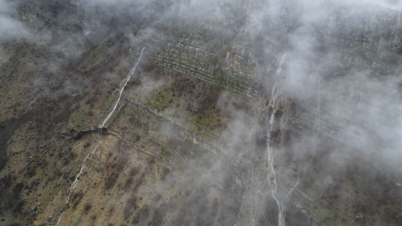 Şelalelerin yer aldığı vadiden geçen akarsu, sisle kaplı dağ manzarasıyla birlikte dronla görüntülendi. Kaydedilen görüntülerde, suyun yeniden akışıyla oluşan doğal manzara dikkat çekti.