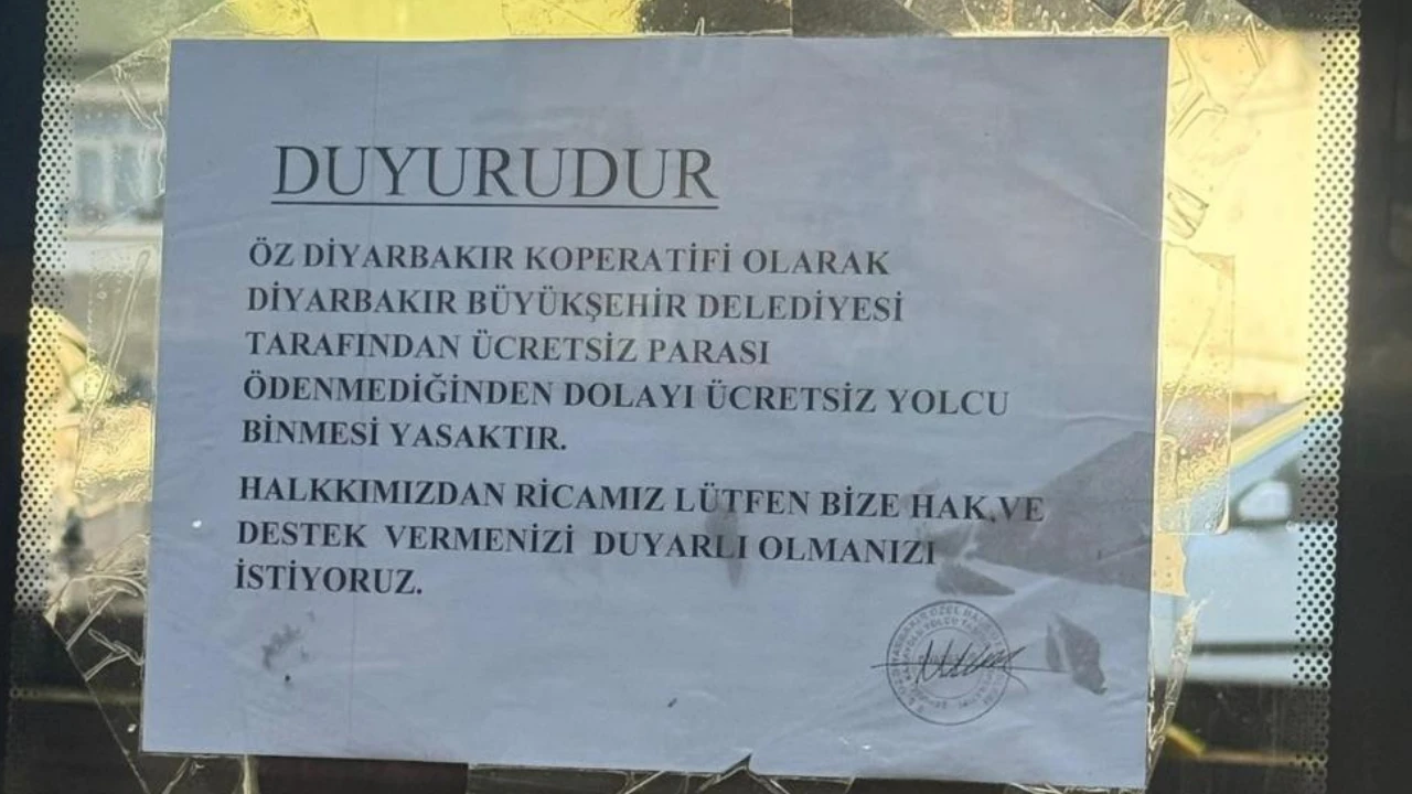 “Öz Diyarbakır Kooperatifi olarak, Diyarbakır Büyükşehir Belediyesi tarafından parası ödenmediğinden dolayı ücretsiz yolcu binmesi yasaktır. Halkımızdan ricamız, lütfen bize hak ve destek vermenizi, duyarlı olmanızı istiyoruz.”