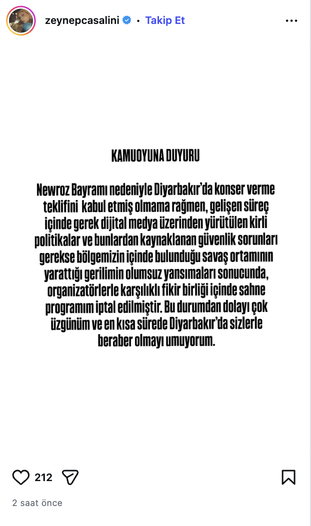 Sanatçı, sosyal medya hesabından yaptığı “Kamuoyuna duyuru” başlıklı açıklamada, Newroz kapsamında Diyarbakır’da konser verme teklifini kabul ettiğini ancak süreç içinde yaşanan gelişmeler nedeniyle programın iptal edildiğini belirtti.